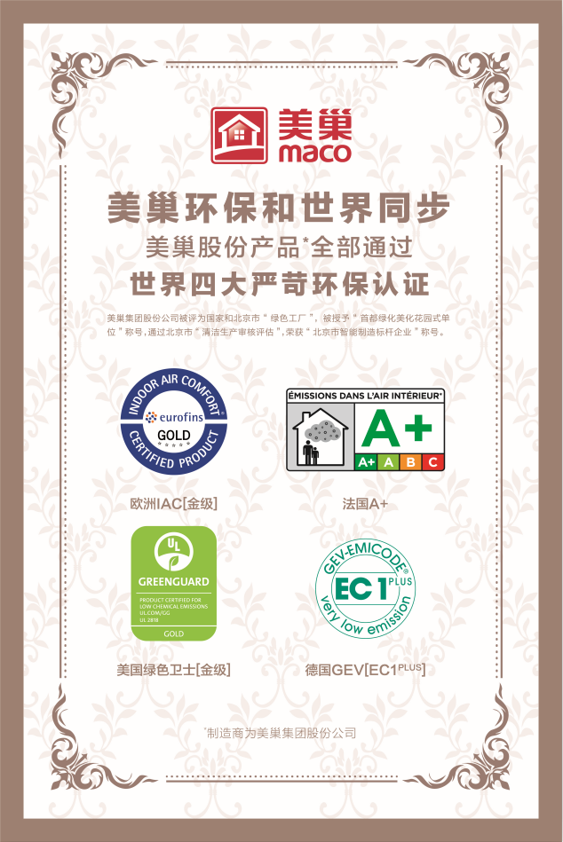 美巢集團(tuán)股份公司產(chǎn)品全部通過美國(guó)UL室內(nèi)空氣質(zhì)量綠色衛(wèi)士GREENGUARD [金級(jí)]認(rèn)證、歐洲Eurofins室內(nèi)空氣質(zhì)量IAC金級(jí)認(rèn)證、德國(guó)GEV低揮發(fā)物釋放產(chǎn)品標(biāo)識(shí)EMICODEEC1PLUS認(rèn)證以及法國(guó)室內(nèi)空氣環(huán)境VOC法規(guī)French A+級(jí)標(biāo)準(zhǔn)。
