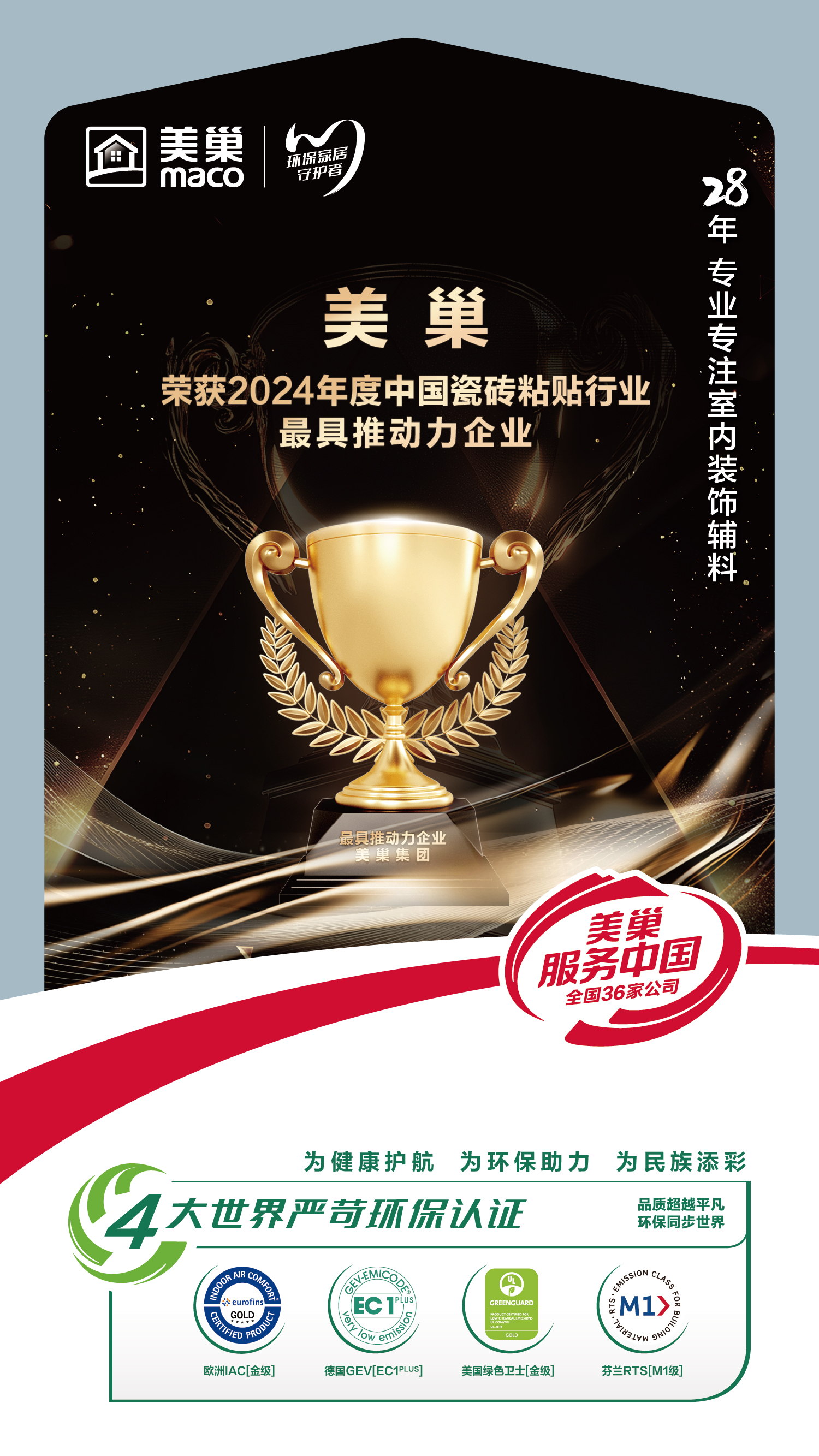 本屆瓷磚粘貼行業(yè)技術(shù)交流大會上,美巢集團再一次以強大的品牌實力收獲了多項榮譽,這不僅僅是行業(yè)的認可,更是來自市場端真實的反饋。“卷出新高度 行業(yè)再升級”,美巢將繼續(xù)帶著不斷推動行業(yè)不斷升級的責任,堅定“環(huán)保家居守護者”的決心,以“為健康護航、為環(huán)保助力、為民族添彩”的企業(yè)使命,滿足更多家裝消費者的產(chǎn)品使用需求,成為更多用戶信賴的室內(nèi)家裝輔料品牌。