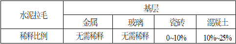 A、水泥拉毛:將本品加水稀釋后的混合液體與水泥(建議使用符合GB175要求的強(qiáng)度等級(jí)不低于42.5級(jí)的普通硅酸鹽水泥)按1:2攪拌成膠漿狀,涂抹于基層表面,待硬化后即可開始后續(xù)施工。不同基層加水稀釋比 例如表所示。
