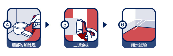 基層修補:裂縫、凹凸不平處和孔洞墻面需用墻諾快硬抹灰砂漿進行填充找平,地面需用坊水固堵漏靈進行修補找平,陰陽角用坊水固堵漏靈抹成圓弧角或鈍角,防止產生裂縫; 基層清理:基層應堅實、平整、無灰渣、無浮灰、無明水,地漏和管道根部除去銹跡和灰渣; 基層潤濕:需使用刷子或滾筒用水進行預潤濕。若使用墻錮混凝土界面劑或地錮地面界面劑進行潤濕處理,可增大涂刷面積,提高防水涂層粘結力。 |