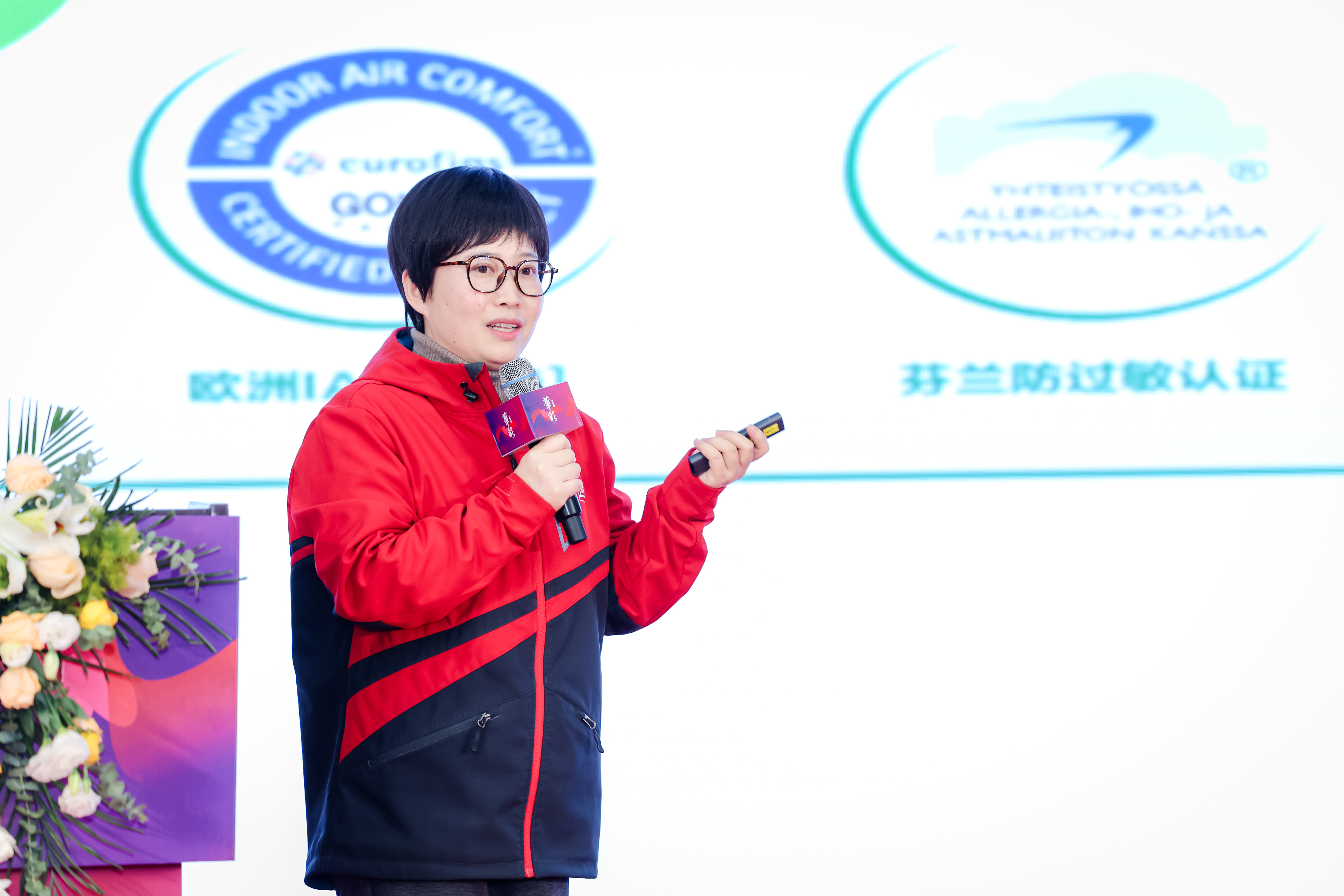 環(huán)保矩陣則由技術(shù)部產(chǎn)品認(rèn)證經(jīng)理姜利紅重點(diǎn)闡述。她從消費(fèi)者最關(guān)心的健康與安全出發(fā),詳細(xì)的介紹了華彩在環(huán)保維度上的整體布局,全線產(chǎn)品在VOC釋放量、氣味等級(jí)等關(guān)鍵指標(biāo)上,均按照遠(yuǎn)高于一般產(chǎn)品的標(biāo)準(zhǔn)執(zhí)行,并先后通過了世界四大嚴(yán)苛環(huán)保認(rèn)證:歐洲Eurofins室內(nèi)空氣質(zhì)量IAC金級(jí)認(rèn)證、芬蘭防過敏認(rèn)證(本產(chǎn)品與芬蘭過敏、皮膚和哮喘聯(lián)合會(huì)合作開發(fā))、美國UL室內(nèi)空氣質(zhì)量綠色衛(wèi)士GREENGUARD [金級(jí)]認(rèn)證、芬蘭建筑材料釋放等級(jí)認(rèn)證M1級(jí)。