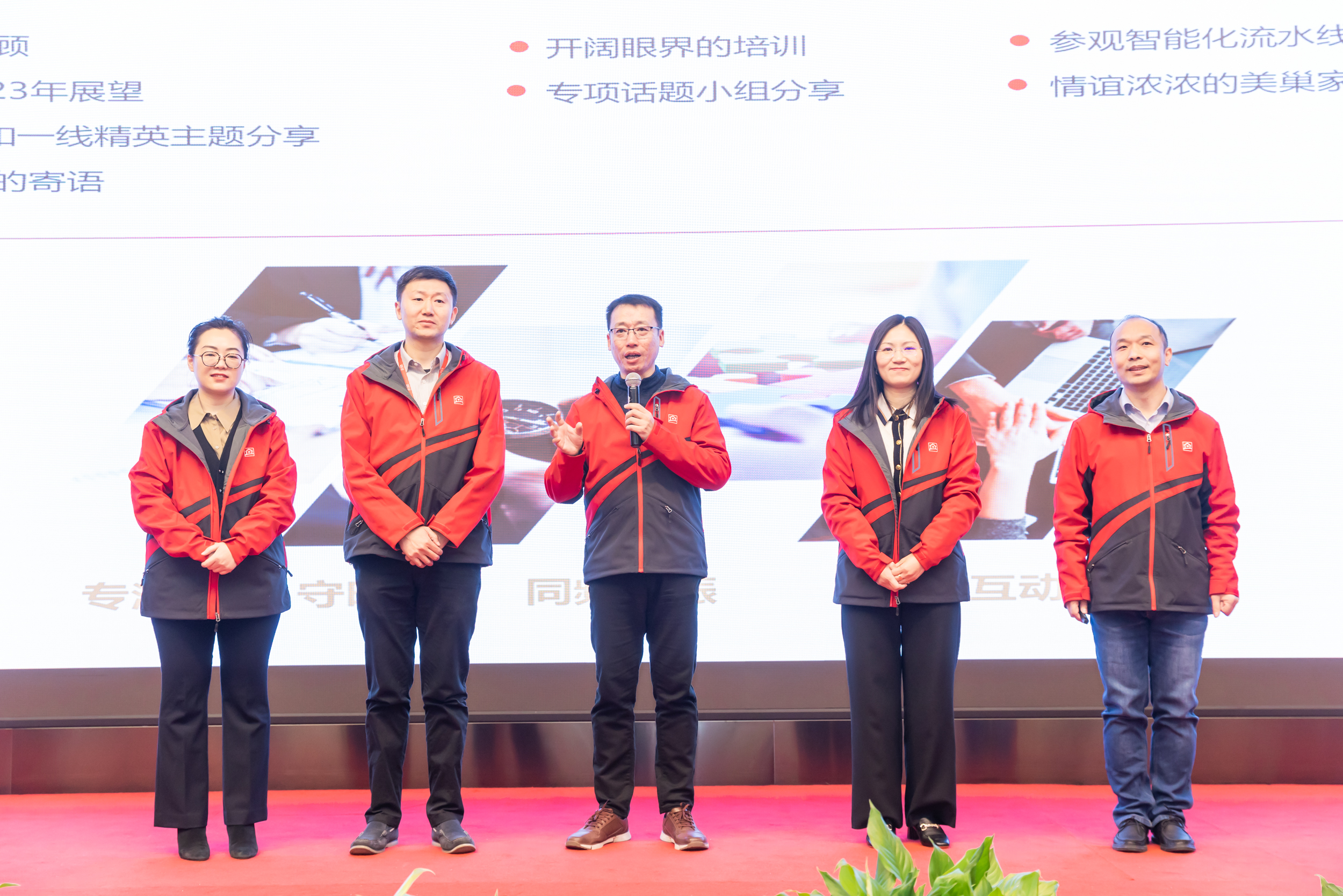 大會(huì)開(kāi)場(chǎng)階段,美巢市場(chǎng)部總監(jiān)賈旭、人力資源部總監(jiān)任娟、財(cái)務(wù)部總監(jiān)閆少彬、品牌部經(jīng)理程娟、運(yùn)營(yíng)管理部經(jīng)理鄭箴以傳遞“家”的力量為主題,先后從市場(chǎng)、團(tuán)隊(duì)、財(cái)務(wù)、品牌、運(yùn)營(yíng)等多角度全景回顧2022年,鼓舞全體市場(chǎng)銷(xiāo)售人員士氣。