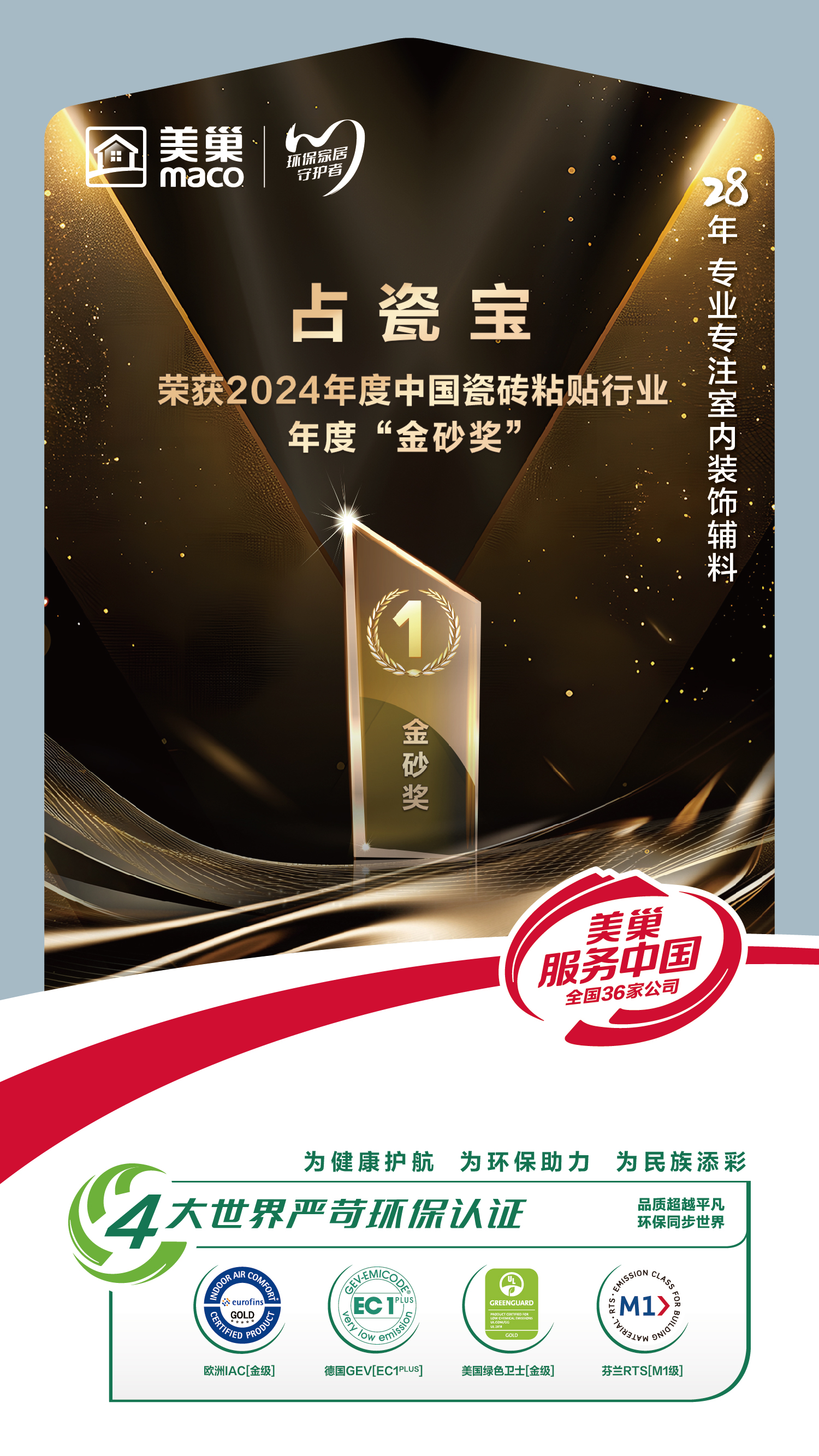 摘要:“卷出新高度 行業(yè)再升級”,日前,由中國陶瓷工業(yè)協(xié)會瓷磚粘貼技術(shù)專業(yè)委員會(TCT)主辦的“2024年度中國瓷磚鋪貼行業(yè)大會暨技術(shù)交流分享會”順利召開。為表彰行業(yè)杰出貢獻,大會對一批優(yōu)秀企業(yè)及個人進行了榮譽授予,美巢集團股份公司(以下簡稱“美巢”)憑借在瓷磚粘貼行業(yè)的貢獻,被認定為“2024年度中國瓷磚粘貼行業(yè)最具推動力企業(yè)”,同時占瓷寶產(chǎn)品再度榮膺“2024年度中國瓷磚粘貼行業(yè)年度產(chǎn)品‘金砂獎’”,這已是占瓷寶連續(xù)多年獲得此項殊榮。