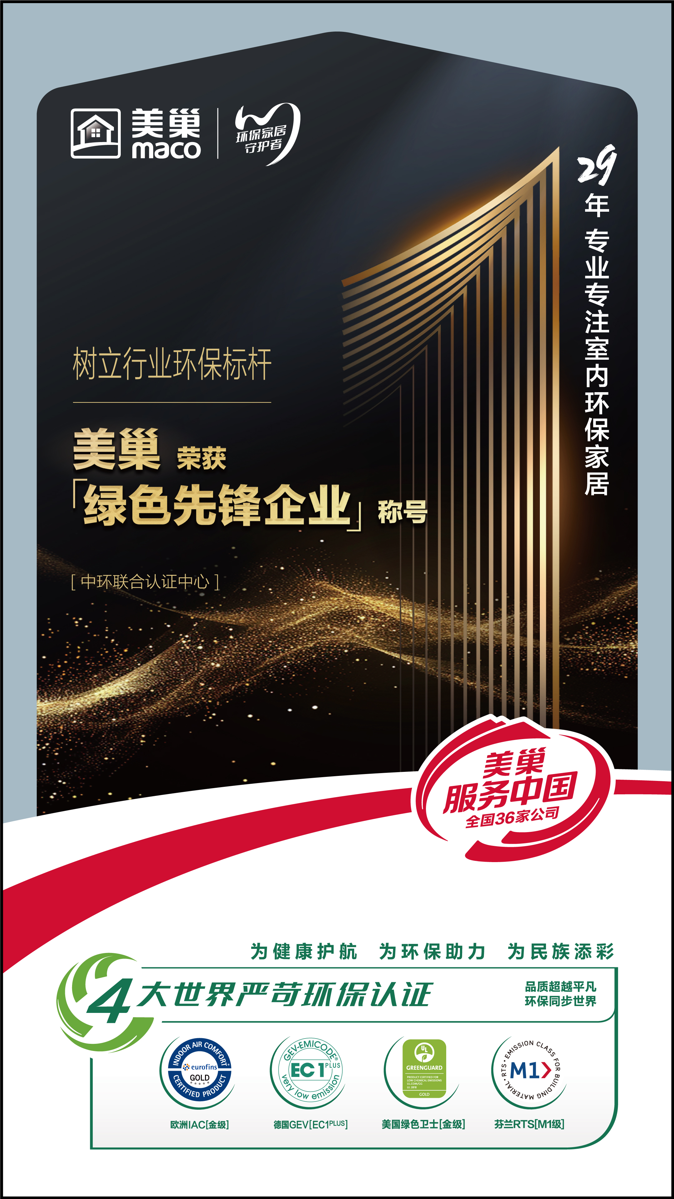 作為室內(nèi)裝飾輔料行業(yè)的領(lǐng)航者和國民的環(huán)保家居守護者,29年來,美巢始終秉持綠色發(fā)展理念,致力于為消費者提供高品質(zhì)、高環(huán)保的室內(nèi)裝飾輔料。如今,美巢旗下產(chǎn)品全部通過了世界四大嚴苛環(huán)保認證:美國UL綠色衛(wèi)士【金級】、歐洲Eurofins IAC【金級】、德國GEV【EC1PLUS】以及芬蘭RTS【M1級】,通過芬蘭M1認證代表產(chǎn)品氣味符合嚴苛認證標(biāo)準。