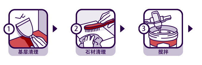 石材背面應(yīng)干燥且無浮灰,在開放時間內(nèi)(一般為20分鐘)完成石材的揉壓鋪貼。禁止無縫鋪貼,縫隙不小于2mm。攪拌好的膠漿須在2小時內(nèi)用完。 |